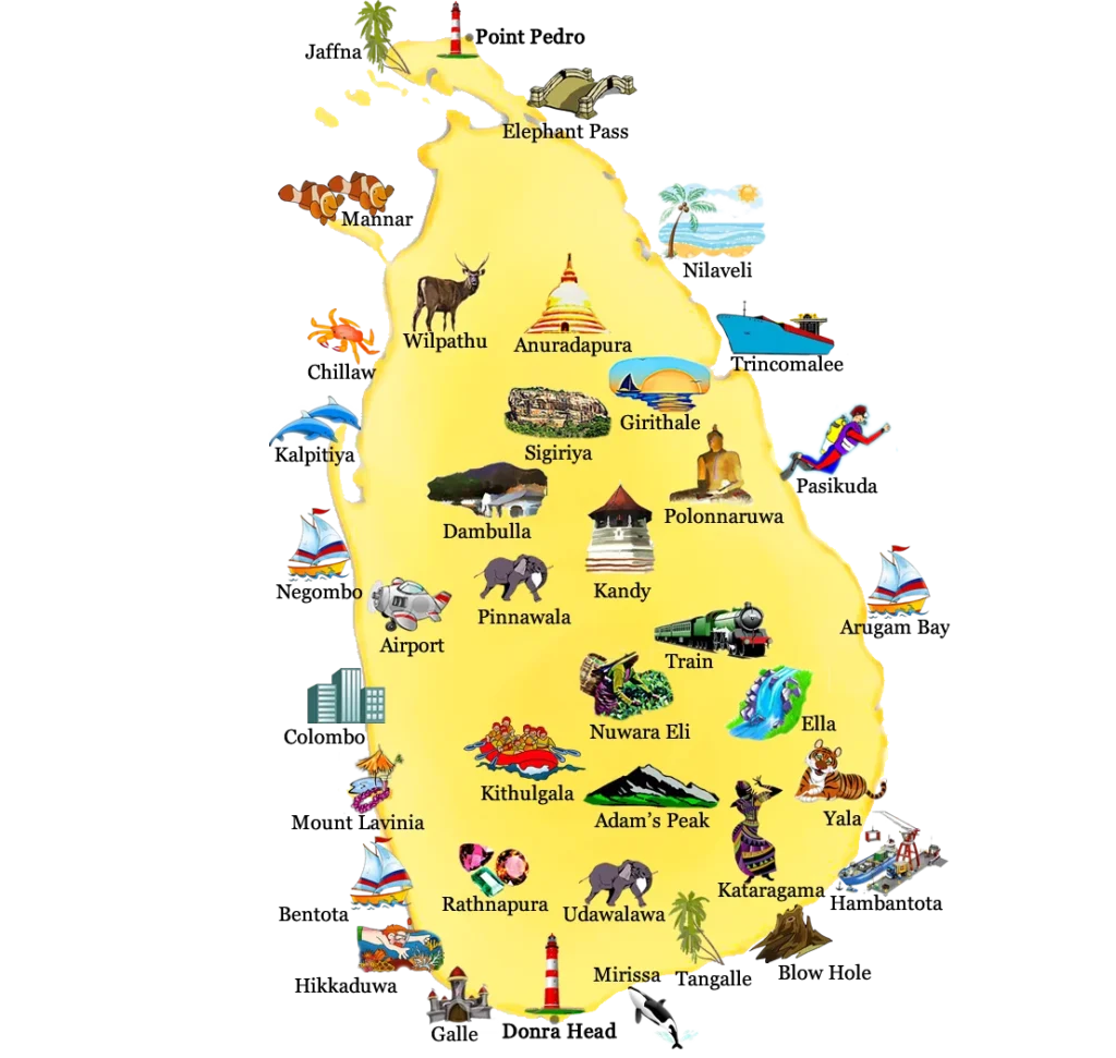 Our map is dotted with incredible sights, and this is your gateway to exploring them in detail. From the iconic rock fortress of Sigiriya and the misty heights of Adam’s Peak to the golden sands of Bentota and the untamed jungles of Yala, every pin on the map tells a story. Dive into our guide to Sri Lanka’s top towns, regions, and national parks to find the specific spots that belong on your bucket list.